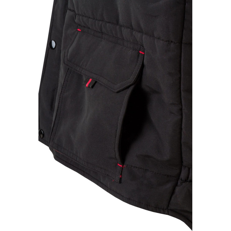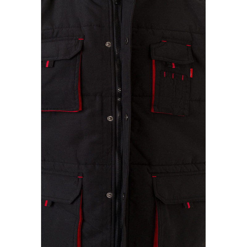 Siete bolsillos: 1 bolsillo de fuelle en el pecho, con tapeta, tirador y velcro 2 bolsillos inferiores de fuelle, con tapeta, tirador y velcro. Debajo de cada uno, 2 bolsillos laterales 1 bolsillo de fuelle en el pecho, con tapeta, tirador y velcro. Sobre él, compartimentos para bolígrafos 1 bolsillo interior de parche