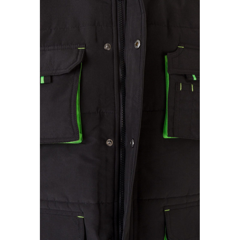 Siete bolsillos: 1 bolsillo de fuelle en el pecho, con tapeta, tirador y velcro 2 bolsillos inferiores de fuelle, con tapeta, tirador y velcro. Debajo de cada uno, 2 bolsillos laterales 1 bolsillo de fuelle en el pecho, con tapeta, tirador y velcro. Sobre él, compartimentos para bolígrafos 1 bolsillo interior de parche