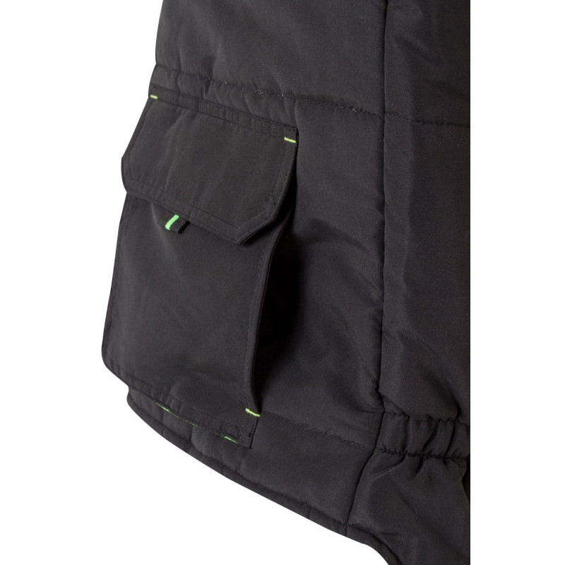Siete bolsillos: 1 bolsillo de fuelle en el pecho, con tapeta, tirador y velcro 2 bolsillos inferiores de fuelle, con tapeta, tirador y velcro. Debajo de cada uno, 2 bolsillos laterales 1 bolsillo de fuelle en el pecho, con tapeta, tirador y velcro. Sobre él, compartimentos para bolígrafos 1 bolsillo interior de parche