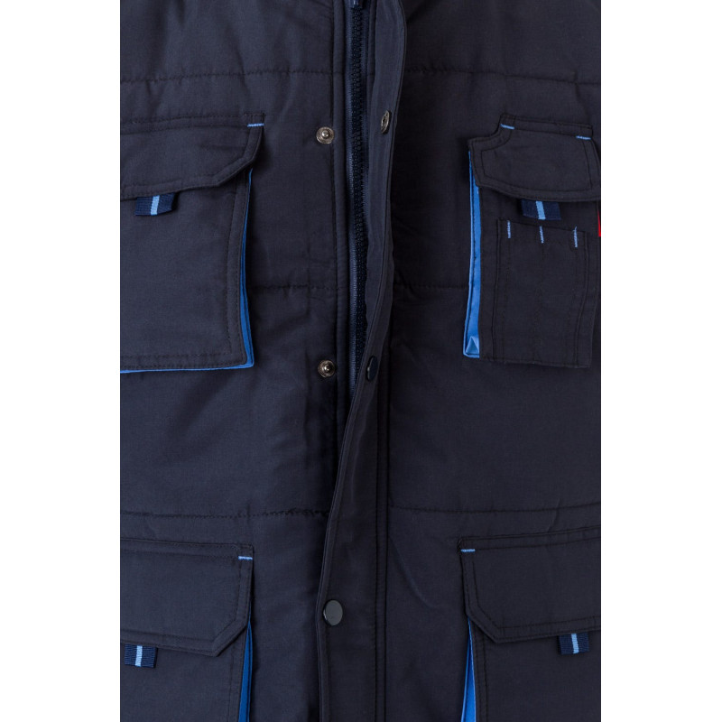 Siete bolsillos: 1 bolsillo de fuelle en el pecho, con tapeta, tirador y velcro 2 bolsillos inferiores de fuelle, con tapeta, tirador y velcro. Debajo de cada uno, 2 bolsillos laterales 1 bolsillo de fuelle en el pecho, con tapeta, tirador y velcro. Sobre él, compartimentos para bolígrafos 1 bolsillo interior de parche